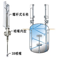 德高潔全自動(dòng)不銹鋼反應(yīng)釜清洗系統(tǒng)具體清洗流程是將三維旋轉(zhuǎn)噴頭伸縮機(jī)構(gòu)安裝在反應(yīng)釜入孔上,伸縮桿伸進(jìn)反應(yīng)釜內(nèi),伸縮機(jī)構(gòu)可采用手動(dòng)、電動(dòng)、液壓等控制,伸縮桿在反應(yīng)釜內(nèi)伸縮和沿反應(yīng)釜內(nèi)壁周圍方向移動(dòng)。根據(jù)具體實(shí)際情況可選用2孔或4孔三維自動(dòng)旋轉(zhuǎn)噴頭,當(dāng)三維自動(dòng)旋轉(zhuǎn)噴頭水平旋轉(zhuǎn)時(shí),水射流形成的旋轉(zhuǎn)力矩帶動(dòng)噴嘴在垂直面內(nèi)旋轉(zhuǎn)。由于三維旋轉(zhuǎn)噴頭與伸縮桿的復(fù)合運(yùn)動(dòng),高壓水射流可以覆蓋反應(yīng)釜內(nèi)任何位置,從而完成反應(yīng)釜的清洗。